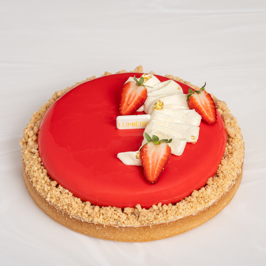 Almond short dough, light cheesecake filling, strawberry jaconde, strawberry mousse, buttery crumble (Nut Free, Contains Almonds)